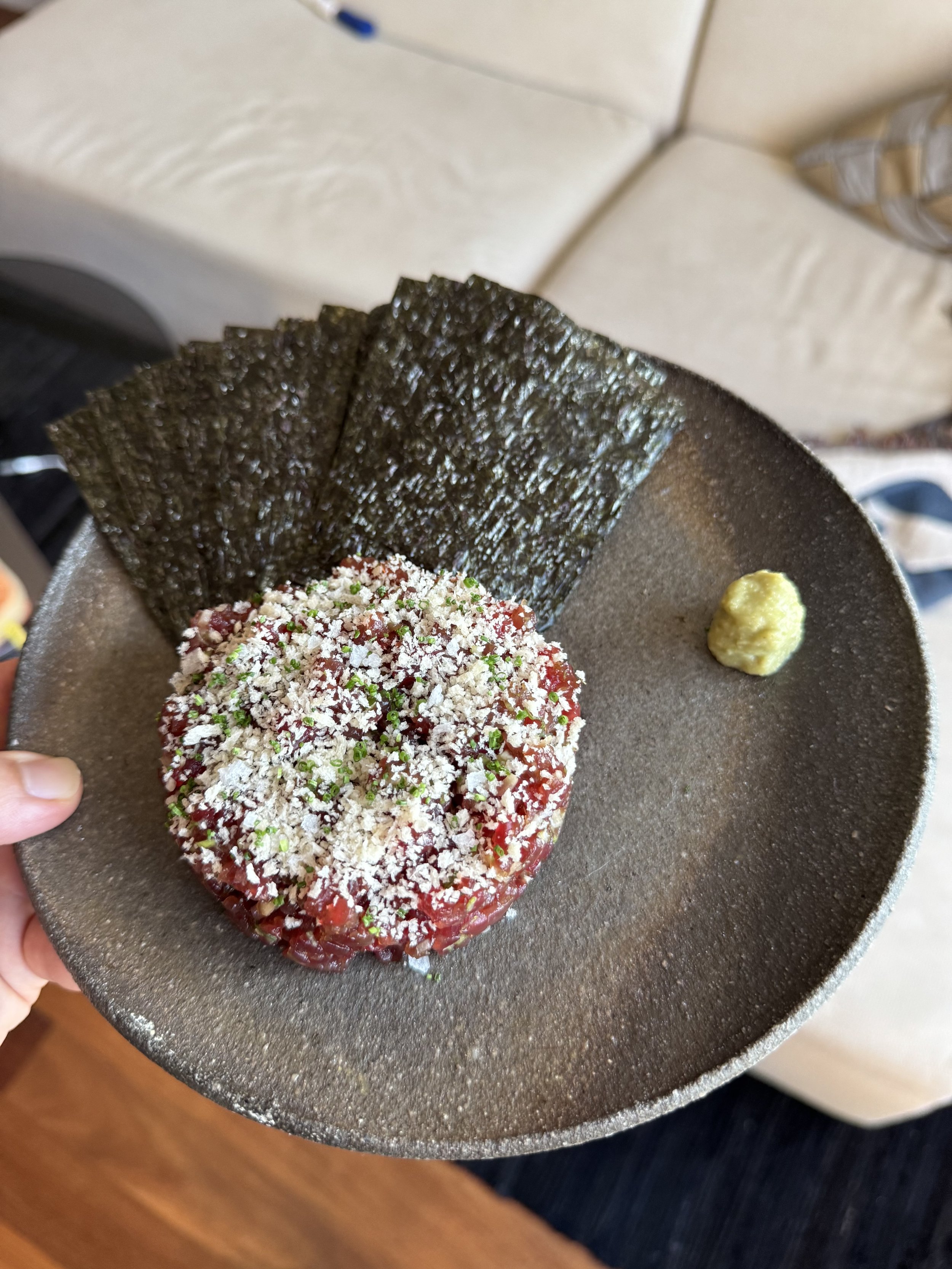 To finish, plate the tuna using a ring mold (or directly onto the plate) and garnish with panko, fleur de sel, chives, and sheets of toasted nori on the side.