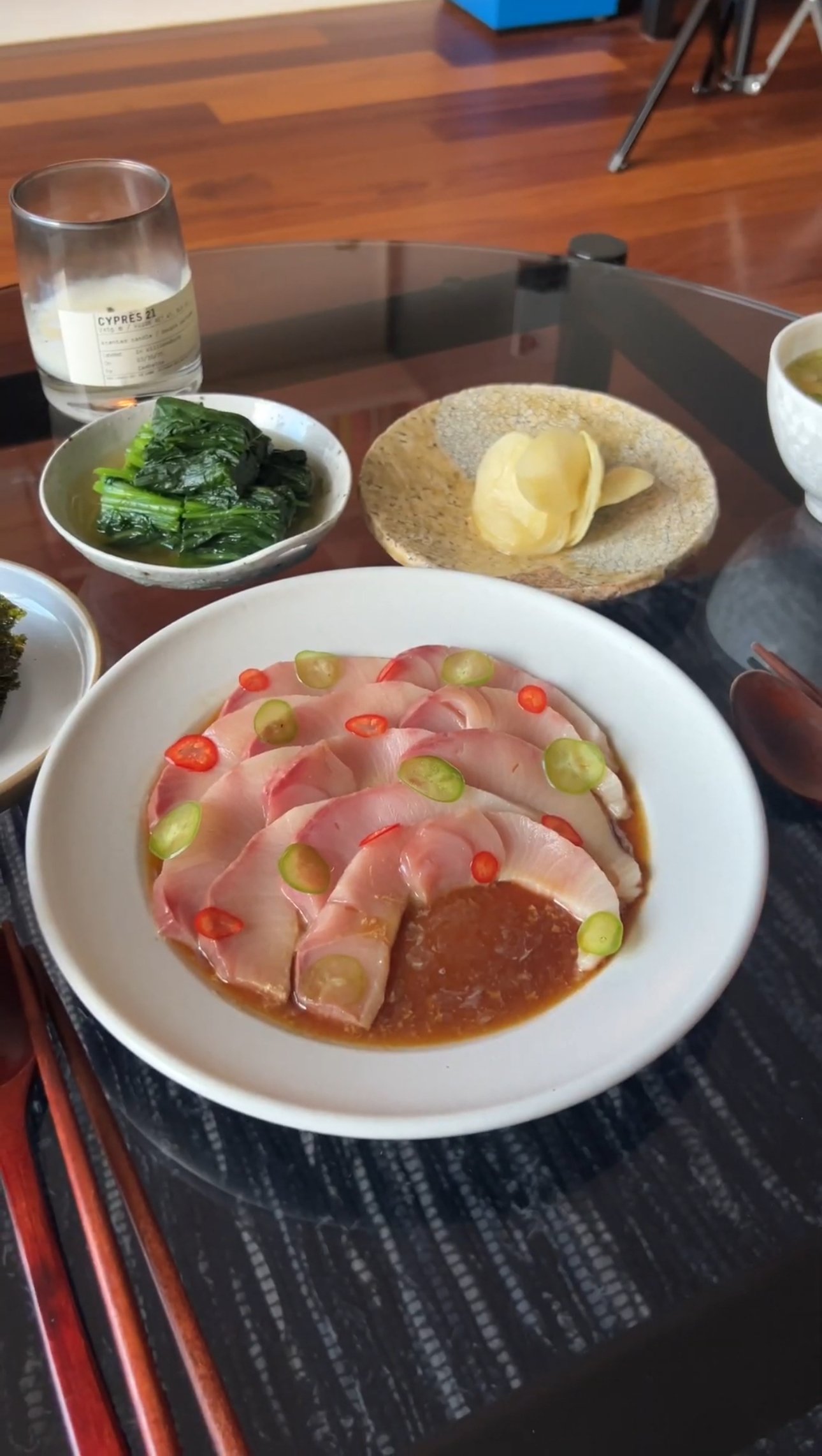 Nostalgia comes in strange forms when you grow up in a restaurant. I remember the distinct odor of the fish market we would visit every Monday, how it would cling to my father’s emerald polo shirt inscribed with the name of the restaurant in gold stitching on his lapel. And the food: agedashi tofu, spicy lobster rolls, and of course, yellowtail crudo. This recipe comes from the restaurant albiet a touch less sweet with the addition of small red chiles for an extra kick. I also made a spinach ohitashi on the side, which is simply spinach that has been blanched and soaked in a slightly sweet and salty dashi broth. Make this in the summer to help cool you down.